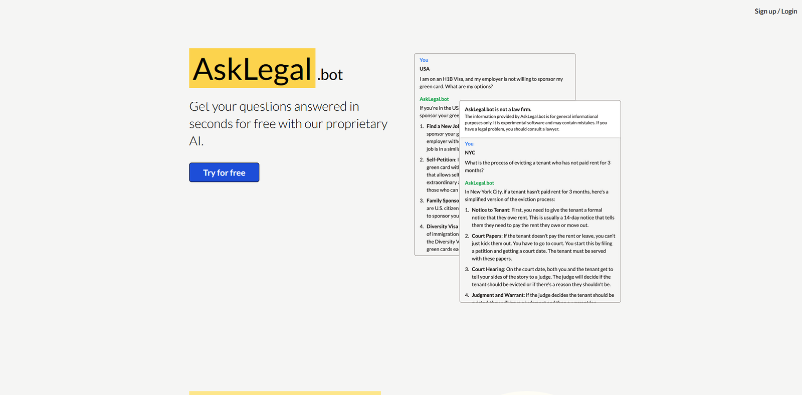 ما هو AskLegal.bot؟ AskLegal.bot هي أداة دردشة قانونية مجانية تعمل بالذكاء الاصطناعي تجيب على أسئلتك القانونية على الفور وتوفر رؤى حول مستندات مختلفة مثل اتفاقيات الإيجار وعقود العمل ووثائق التأمين.... See More