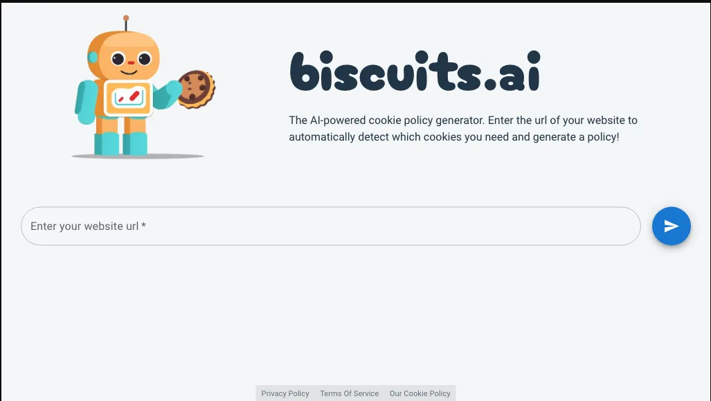 ما هو Biscuits.ai؟ Biscuits.ai هو مولد سياسة ملفات تعريف الارتباط مدعوم بالذكاء الاصطناعي يجعل الامتثال لقواعد الخصوصية أمرًا سهلاً. ما عليك سوى إدخال عنوان URL لموقع الويب الخاص بك، وسيقوم biscuits.... See More