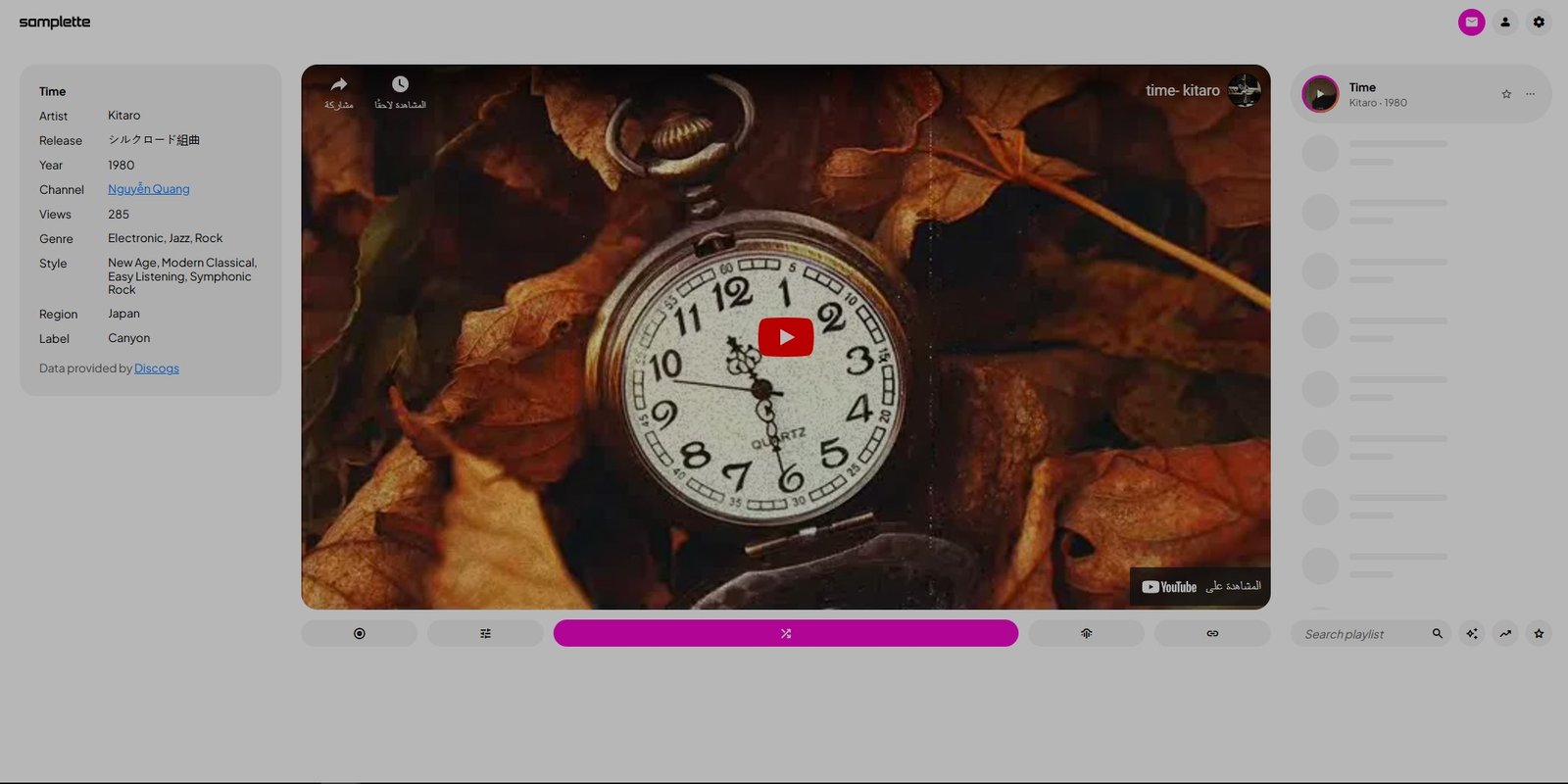 ما هو Samplette؟ Samplett هو موقع ويب للبحث عن عينات موسيقية عشوائية وتوليدها. وهو يوفر مجموعة متنوعة من الأدوات لاكتشاف الموسيقى الجديدة، بما في ذلك مولد الأغاني العشوائية وروليت الإيقاع. كما يوفر ا... See More