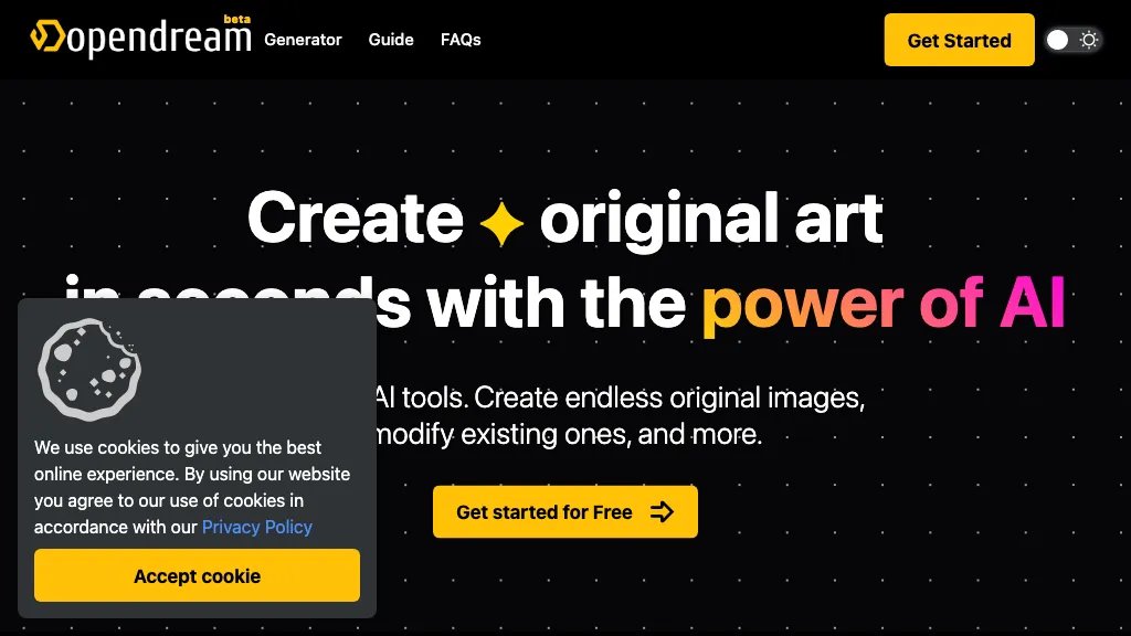 ما هو OpenDream؟ Opendream هي أداة لإنشاء الأعمال الفنية باستخدام الذكاء الاصطناعي مع أربعة نماذج للاختيار من بينها. وهي تسمح للمستخدمين بإنشاء صور أصلية لا حصر لها أو تعديل الصور الموجودة بأوقات معا... See More