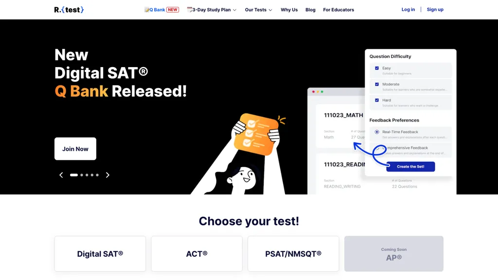 ما هو R.test؟ استعد لاختبارات SAT® وACT® بكفاءة باستخدام أداة الاختبار العملي المدعومة بالذكاء الاصطناعي، r.test. تقدم هذه المنصة الرقمية خططًا دراسية لمدة 3 أيام، وشروحات مرئية خطوة بخطوة، ومجموعة و... See More