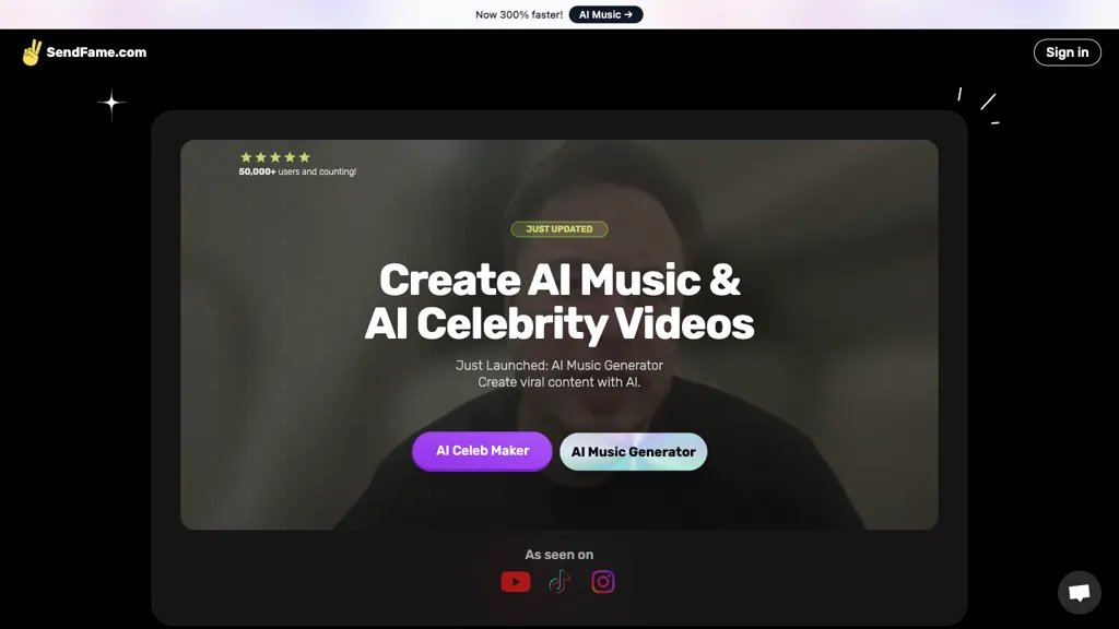 ما هو Sendfame؟ Sendfame هي أداة ذكاء اصطناعي مصممة لإنشاء رسائل موسيقية وفيديو مخصصة للمشاهير بسرعة وكفاءة. يمكن للمستخدمين إنشاء أغانٍ فريدة وأصلية ومحتوى فيروسي من خلال الاستفادة من مكتبة واسعة من... See More