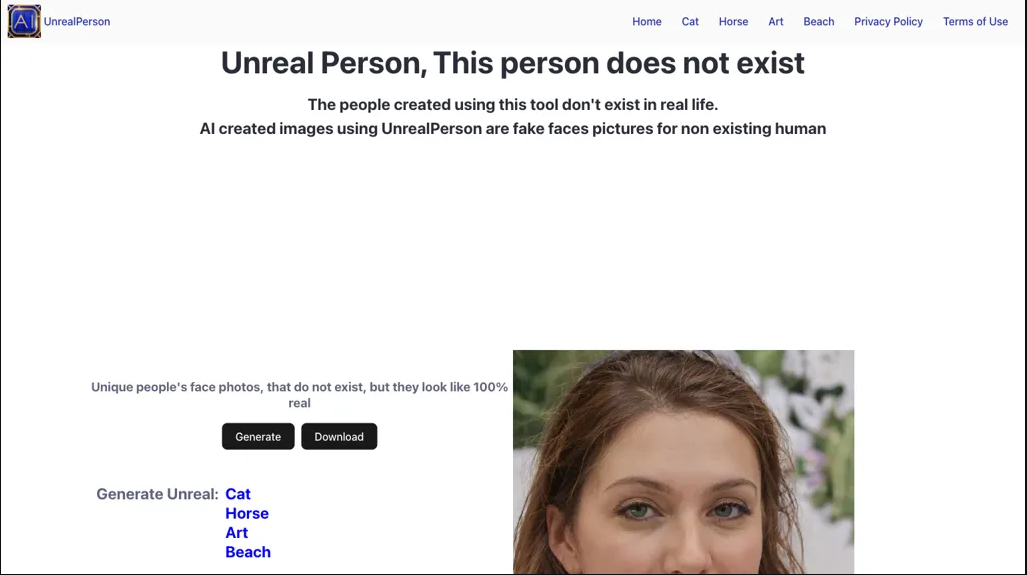 ما هو UnrealPerson؟ "Unreal Person" هي أداة ذكاء اصطناعي تولد صورًا مزيفة لأفراد غير موجودين وحيوانات مثل القطط والخيول والفن. بفضل تقنية الذكاء الاصطناعي المتقدمة، يمكنها إنشاء صور واقعية تبدو أصلية... See More