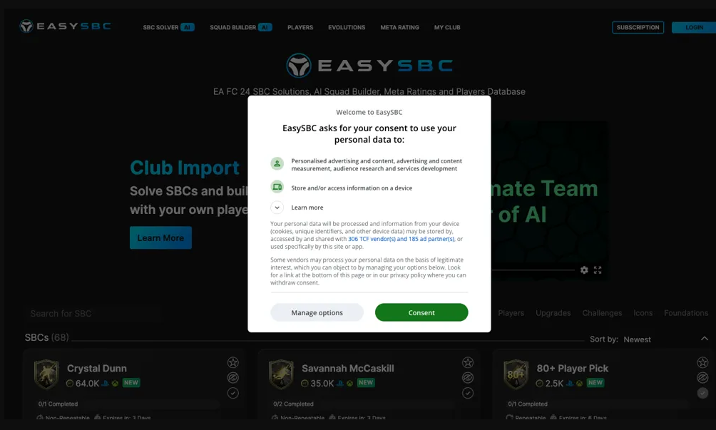 ما هو EasySBC؟ "EA FC 24 SBC Solutions" هي أداة لبناء الفرق بالذكاء الاصطناعي وقاعدة بيانات اللاعبين التي تمكن المستخدمين من استيراد بيانات النادي بسهولة وحل تحديات بناء الفرق (SBCs) وبناء الفرق با... See More