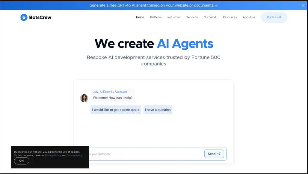 ما هو Botscrew.com؟ Botscrew هي شركة متخصصة في تطوير برامج المحادثة الآلية تركز على إنشاء حلول مخصصة مدعومة بالذكاء الاصطناعي لمختلف الصناعات، بما في ذلك الرعاية الصحية وخدمة العملاء. باستخدام التقني... See More