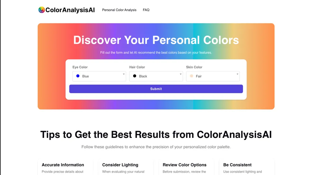 ما هو Coloranalysisai؟ ColorAnalysisAI هي أداة مصممة لتقديم توصيات لوحة الألوان المخصصة بناءً على الخصائص الفردية مثل لون العين والشعر والبشرة. يملأ المستخدمون نموذجًا يوضح ميزاتهم بالتفصيل، مما يسمح... See More