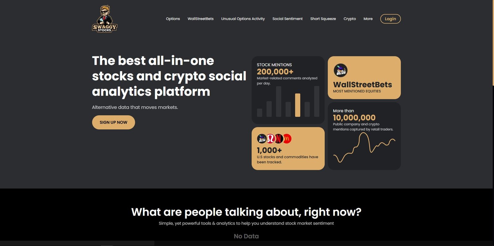 ما هو SwaggyStocks؟ Swaggi Stocks هي أداة بسيطة ولكنها قوية مصممة للمساعدة في فهم معنويات سوق الأوراق المالية. فهي تتعقب منافذ التواصل الاجتماعي المختلفة وتقدم وجهات نظر في الوقت الفعلي حول الحديث عن... See More