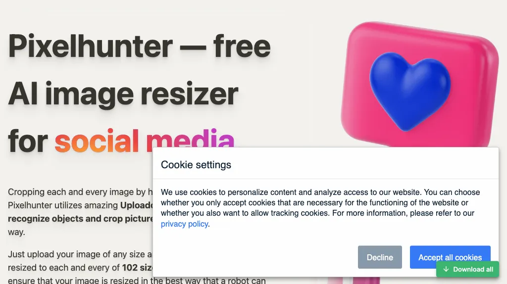 ما هو Pixelhunter؟ توفر أداة Pixelhunt AI تغيير حجم الصور مجانًا لمنشورات وسائل التواصل الاجتماعي. تستخدم واجهة برمجة تطبيقات ذكية للتعرف على الصور وقصها بطريقة أكثر ذكاءً، وتغيير حجمها تلقائيًا إلى 1... See More