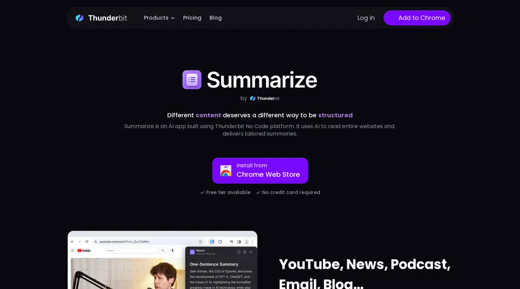 ما هو Summarize by Thunderbit؟ تعمل أداة "Summarize" من Thunderbit على تبسيط استهلاك المحتوى وتنظيمه. يمكنك بسهولة تلخيص أنواع مختلفة من محتوى الويب، بما في ذلك مقاطع فيديو YouTube والمقالات الإخبارية... See More