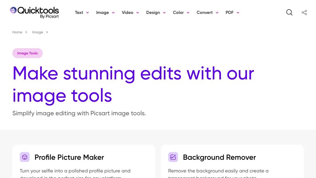 ما هو QuickTools by Picsart؟ هذه أداة صور عبر الإنترنت تقدم مجموعة من الميزات بما في ذلك إزالة الخلفية وتغيير حجم الصورة وإضافة نص إلى الصور ولوحات الألوان وتحويل الصور والمزيد. تتضمن الأداة أيضًا أد... See More