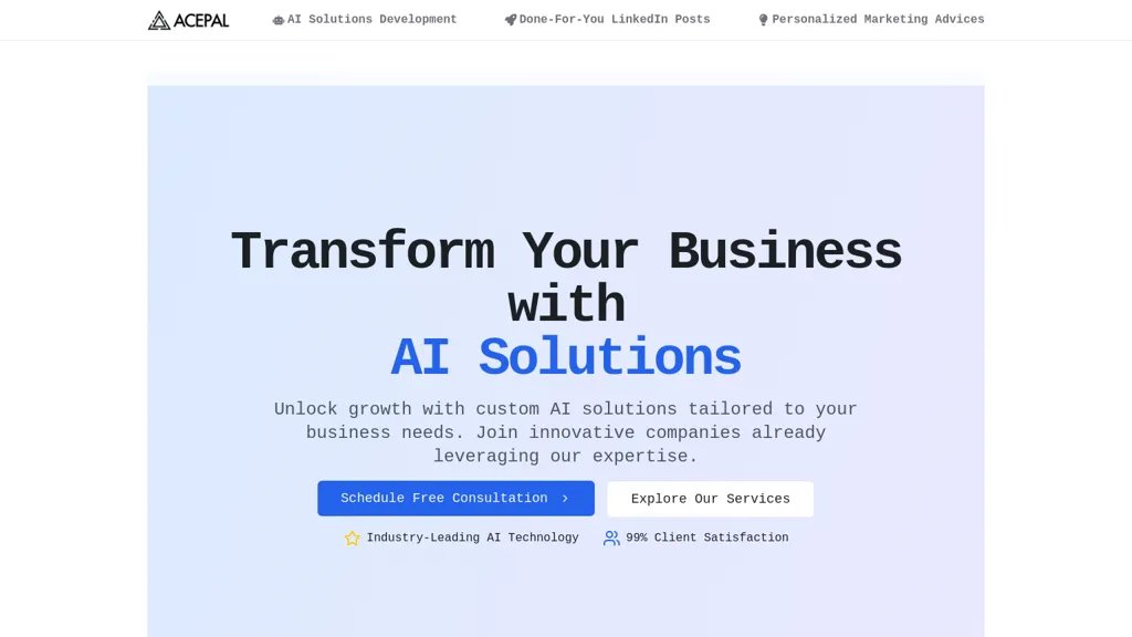 ما هو ACEPAL؟ تقدم Acepal حلولاً مخصصة تعتمد على الذكاء الاصطناعي ومصممة لتعزيز العمليات التجارية عبر مختلف القطاعات. يمكن للمستخدمين الاستفادة من حلول الذكاء الاصطناعي المخصصة، مما يتيح التكامل السل... See More