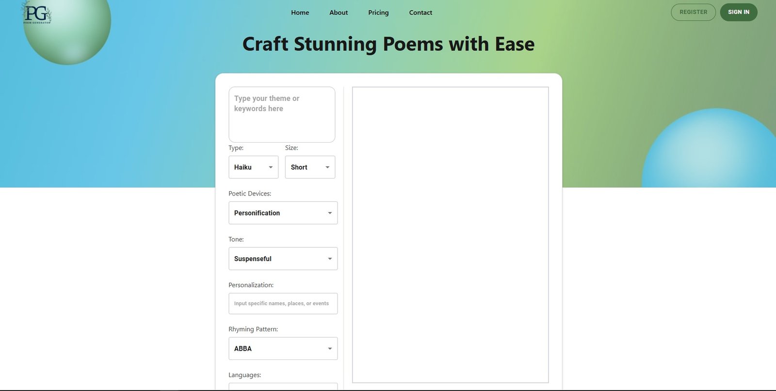 ما هو AI Poem Generator؟ PoemGenerator.io هي أداة الانتقال إلى إنشاء قصائد جميلة ومخصصة ببضع نقرات فقط. سواء كنت بحاجة إلى رسالة صادقة أو قطعة إبداعية لحدث خاص أو كنت تريد فقط استكشاف التعبير الشعري،... See More