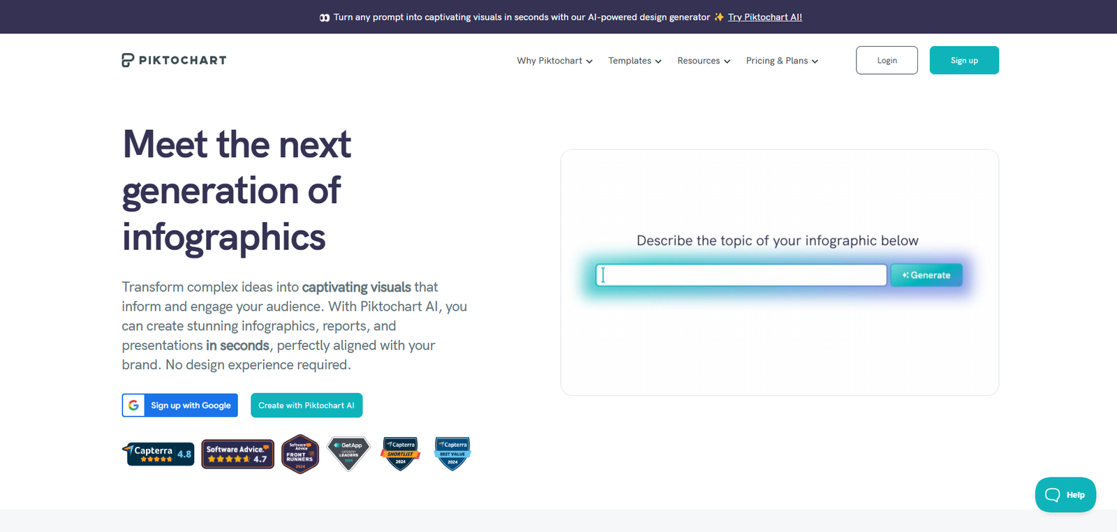 ما هو Piktochart؟ قم بإنشاء صور جذابة في ثوانٍ مع Piktochart AI، صانع الرسوم البيانية التوضيحية المفضل لديك. تتيح لك هذه الأداة التي تعمل بالذكاء الاصطناعي تحويل الأفكار إلى رسوم بيانية توضيحية وملصقا... See More