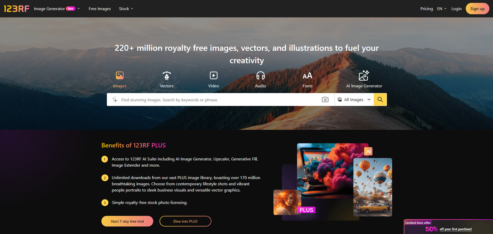 ما هي صور 123RF AI؟ تقدم 123RF مجموعة من أدوات الذكاء الاصطناعي المصممة لتعزيز الإبداع وإنشاء المحتوى. تشمل الميزات الرئيسية مولد الصور AI، وتحويل الرسم التخطيطي إلى صورة، وتبديل الوجه، ومحسن الصورة،... See More