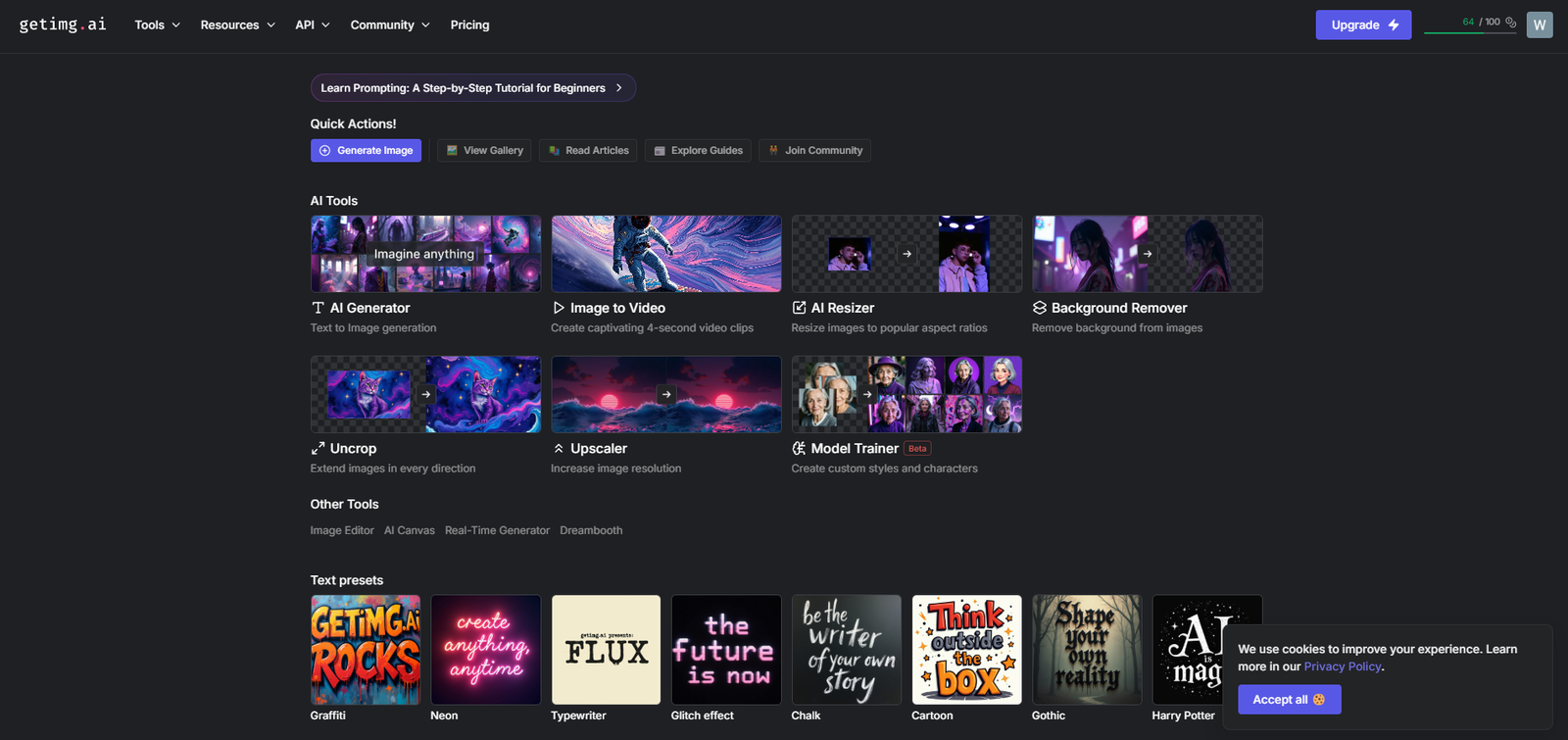 ما هو Getimg.ai؟ Getimg.ai عبارة عن مجموعة أدوات إبداعية متكاملة للذكاء الاصطناعي مصممة لإحداث ثورة في إنشاء الصور وتحريرها. يمكن للمستخدمين إنشاء صور من مطالبات نصية في ثوانٍ، مما يسمح بعملية تصميم م... See More