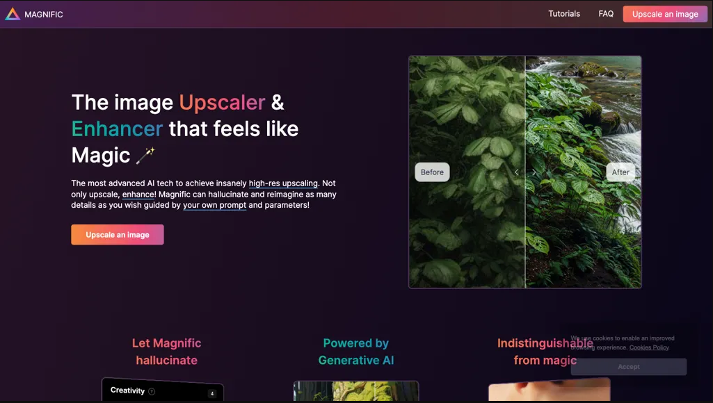 ما هو Magnific AI؟ Magnific AI هو أداة متقدمة لتحسين وتحسين جودة الصور مدعومة بتقنية الذكاء الاصطناعي التوليدي. بفضل قدراته السحرية في تحسين الجودة، يمكن للمستخدمين الحصول على صور عالية الدقة بشكل لا... See More