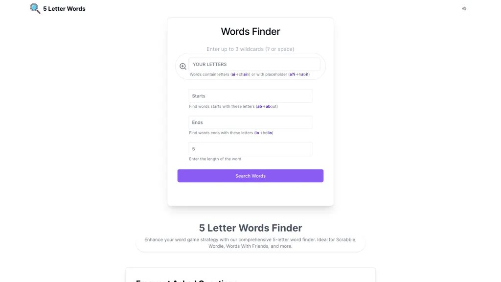 ما هي الكلمات المكونة من 5 أحرف؟ 5 Letter Words هي أداة بحث عن الكلمات تعمل بالذكاء الاصطناعي ومصممة خصيصًا لعشاق اللغة ولاعبي ألعاب الكلمات. توفر هذه الأداة للمستخدمين القدرة على العثور على كلمات مك... See More