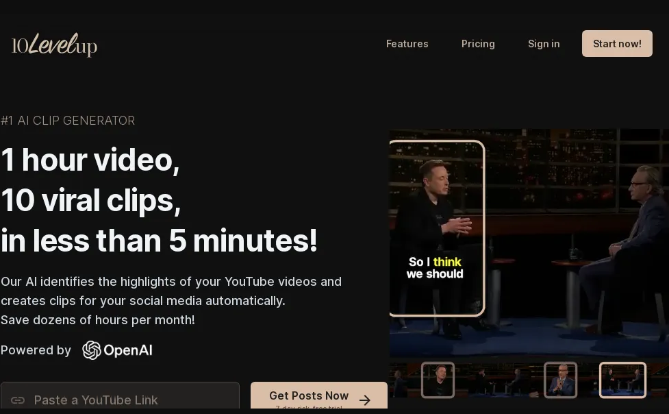ما هو 10LevelUp؟ 10levelup هي أداة ذكاء اصطناعي مصممة لمساعدة منشئي المحتوى على إعادة استخدام محتوى الفيديو الطويل وتحويله إلى مقاطع قصيرة جذابة وجاهزة للانتشار لاستخدامها على وسائل التواصل الاجتماعي... See More