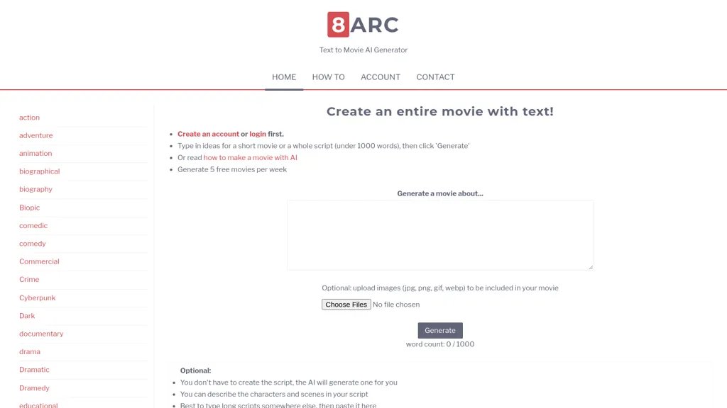 ما هو 8 Arc؟ 8arc هو مولد أفلام يعتمد على النص ومصمم لمساعدة المستخدمين في إنشاء مقاطع فيديو قصيرة وإعلانات سينمائية بأقل جهد. تعمل الأداة على تبسيط عملية صناعة الأفلام إلى ثلاث خطوات سهلة، مما يسمح... See More