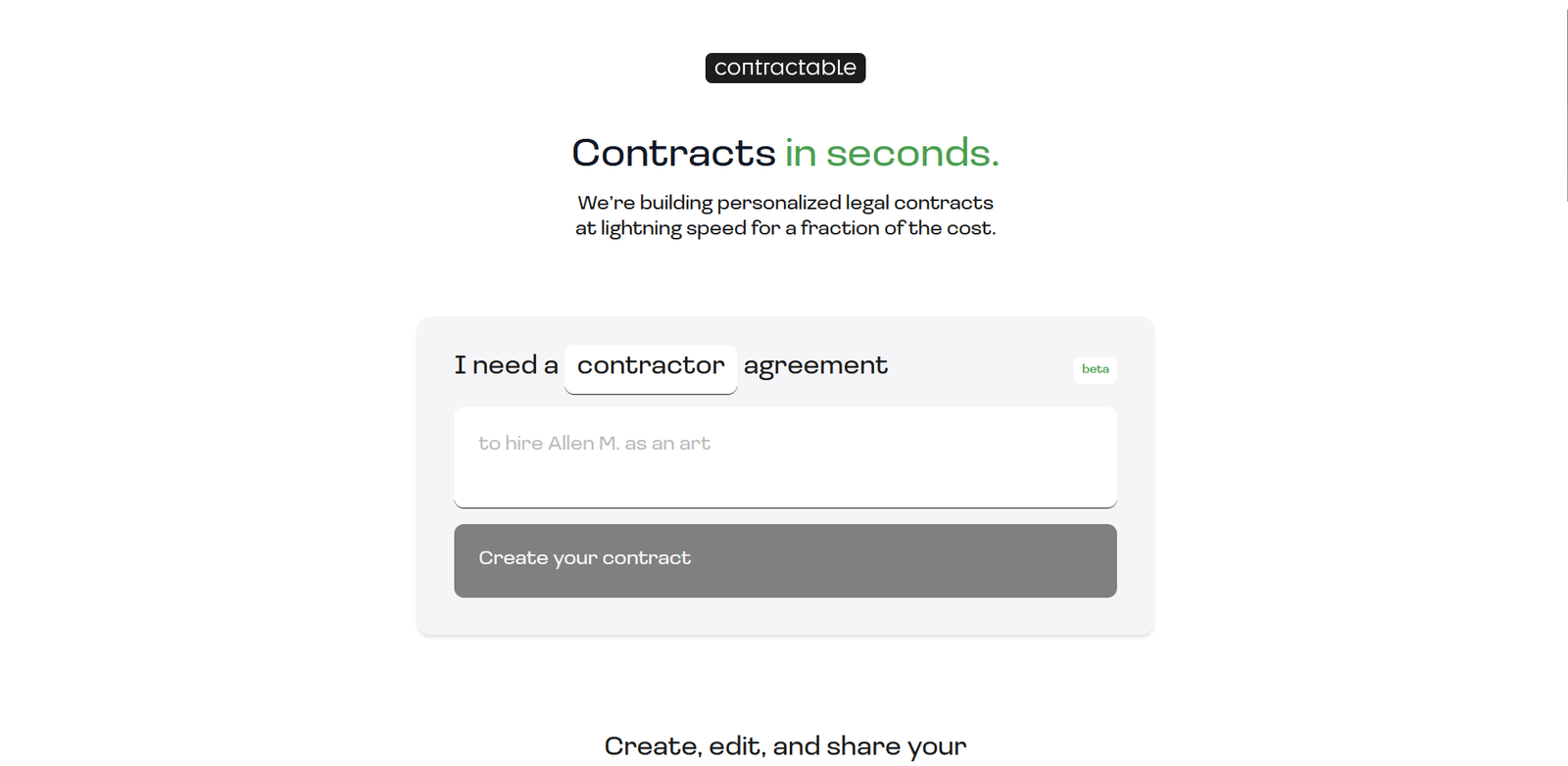 ما هو Contractable.AI؟ Contractable هو مولد عقود مخصص للأفراد والشركات الصغيرة. تصفح أنواع العقود التي يوفرها فريقنا من المحترفين القانونيين، ثم سننشئ مستندًا يناسب حالة الاستخدام الخاصة بك بشكل أفضل... See More