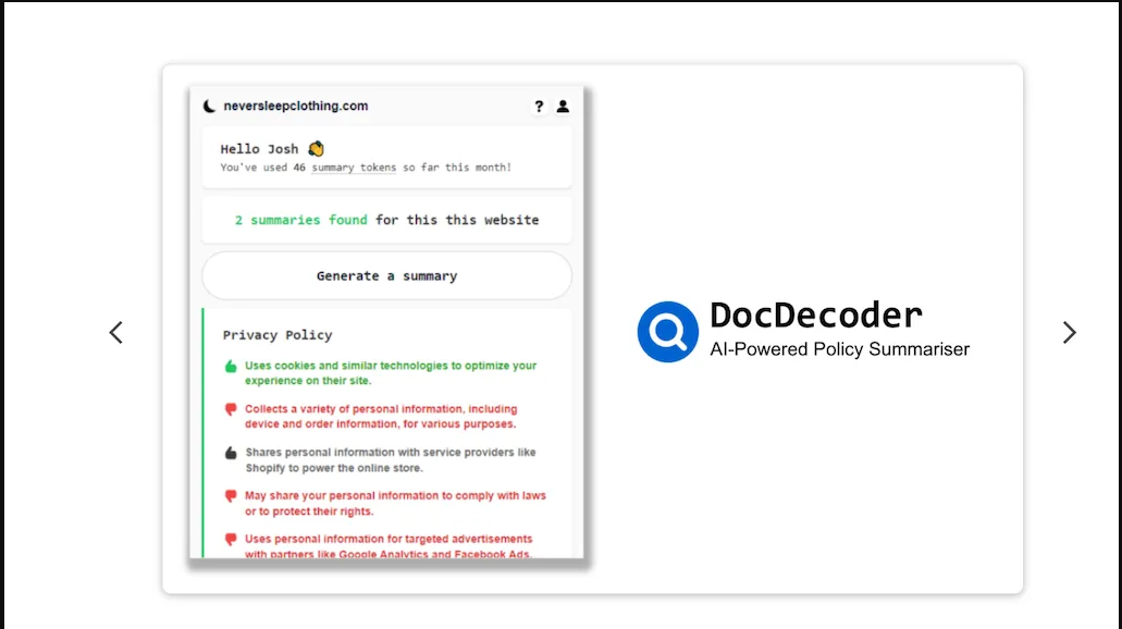 ما هو DocDecoder؟ يستخدم ملحق متصفح DocDecoder GPT-4 لإنشاء ملخصات واضحة وموجزة للسياسات القانونية لأي موقع ويب لتتصفحها قبل قبولها. ما عليك سوى فتح الملحق على أي موقع ويب وعرض ملخصات السياسات القانون... See More