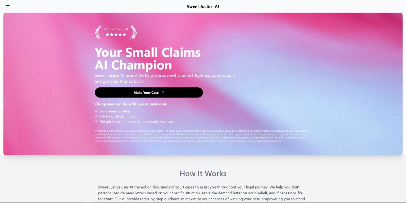 ما هو Sweet Justice AI؟ Sweet Justice AI هي أداة قانونية متخصصة مصممة لمساعدة المستأجرين في محكمة المطالبات الصغيرة ضد الملاك والشركات. فهي توفر للمستخدمين القدرة على صياغة خطابات مطالبة مخصصة ومصممة... See More