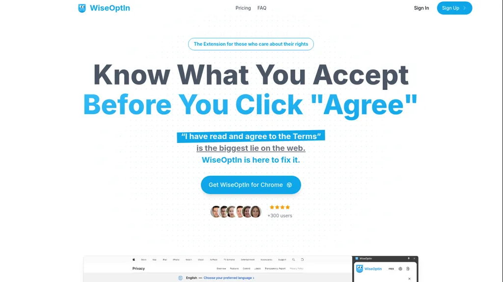 ما هو WiseOptIn؟ WiseOptin هو ملحق للمتصفح مصمم لتعزيز فهم المستخدم لسياسات الخصوصية عبر الإنترنت وشروط الخدمة. فهو يكتشف تلقائيًا متى يواجه المستخدمون اتفاقيات حساب جديدة، مما يوفر تقييمات واضحة للشر... See More