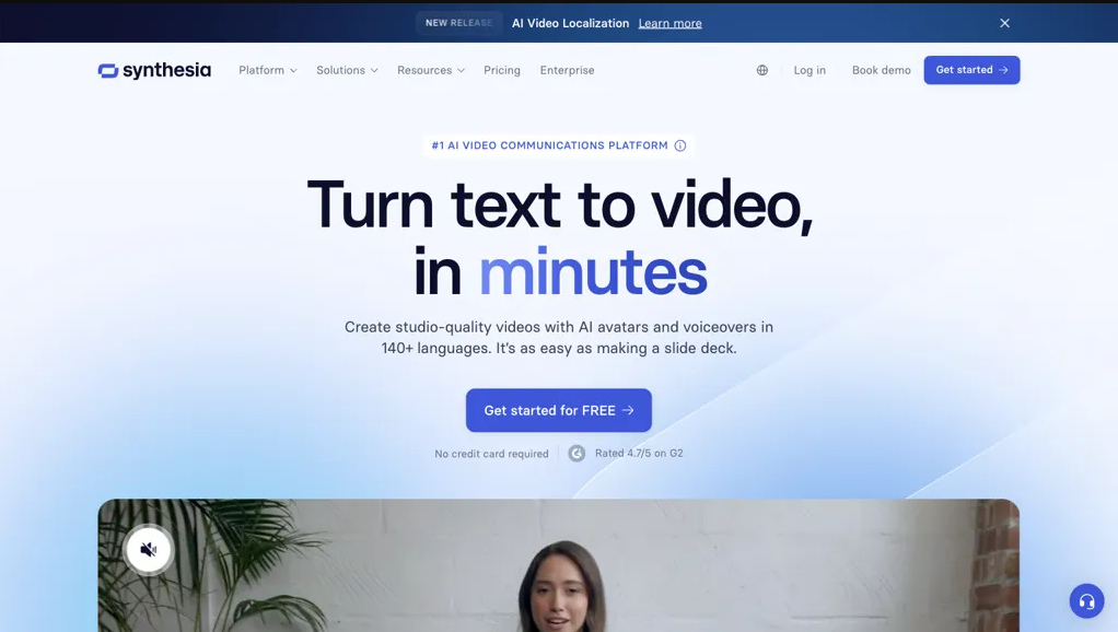ما هو Synthesia؟ Synthesia عبارة عن منصة اتصالات فيديو تعتمد على الذكاء الاصطناعي ومصممة لتبسيط وتحسين إنتاج الفيديو. وهي تسمح للمستخدمين بإنشاء مقاطع فيديو بجودة احترافية دون الحاجة إلى ميكروفونات أ... See More