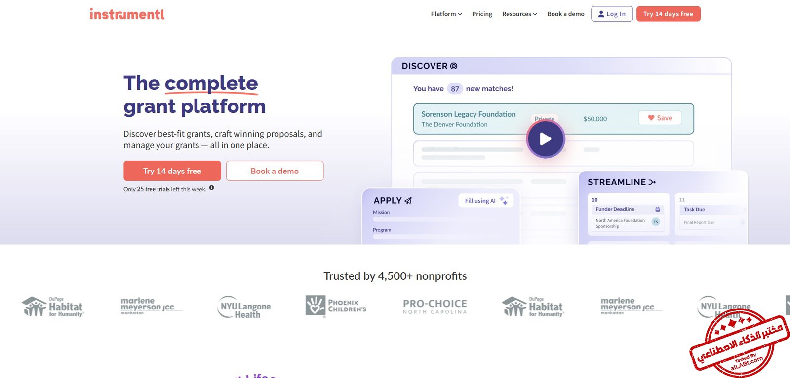 ما هو Instrumentl؟ هو منصة متكاملة للمنظمات غير الربحية والاستشاريين تساعد في العثور على المنح، إدارتها، ومتابعتها عبر دورة حياتها الكاملة — من البحث إلى التقديم والمتابعة—كل ذلك ضمن بيئة تعاونية موج... See More